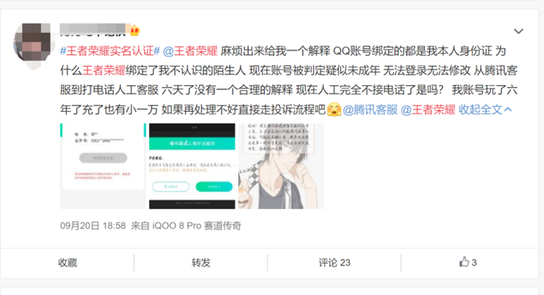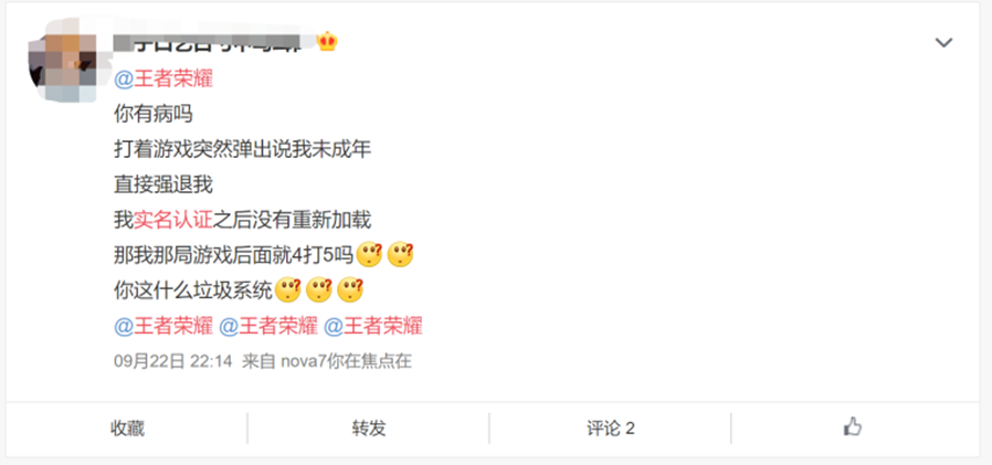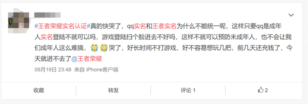 微博上,有网友@王者荣耀,并带上热搜话题#王者荣耀实名认证#,吐槽到:“QQ实名和王者实名,为什么不能统一呢,这样只要qq是成年人实名登录不就可以了吗,游戏登录扫个脸进去不好吗,这样不就可以预防未成年人,也不会让我们成年人这么难搞。”