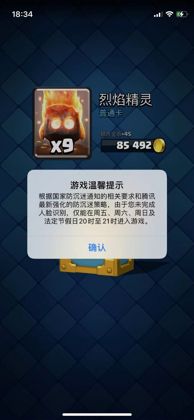 根据国家防沉迷通知的相关要求和腾讯最新强化的防沉迷策略,由于您未完成人脸识别,仅能在周五、周六、周日及法定节假日20时至21时进入游戏。