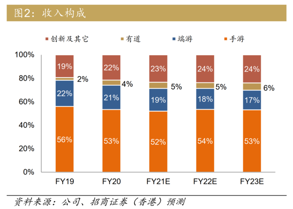 从收入构成来看,虽然网易有道和创新类的占比在不断提高,但游戏(含手游、端游)依旧是主要收入来源。