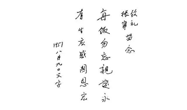 1957年,父亲杨武之离开瑞士前给杨振宁留下的手书:“每饭勿忘亲爱永,有生应感国恩宏”。