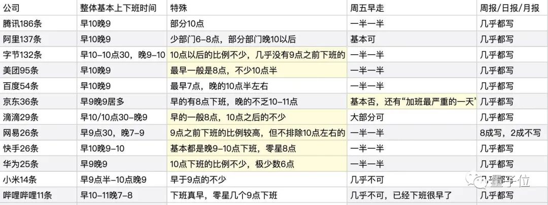不仅包含大大小小的互联网公司,还横跨金融、咨询、房地产,乃至石油、建筑等传统行业。给出了上下班时间和一周上班天数不说,午饭/晚饭时间、周三周五是否特殊、是否要写周报/日报……这样的细节也全都齐备。简直是校招生必备,打工人宝藏有木有。