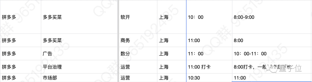但从这5条数据来看,拼多多员工早上虽然11点上班的居多,但除了2位8点下班的,还是有3位10~11点才下,看来“11 11 6”的“11 11”还在。
