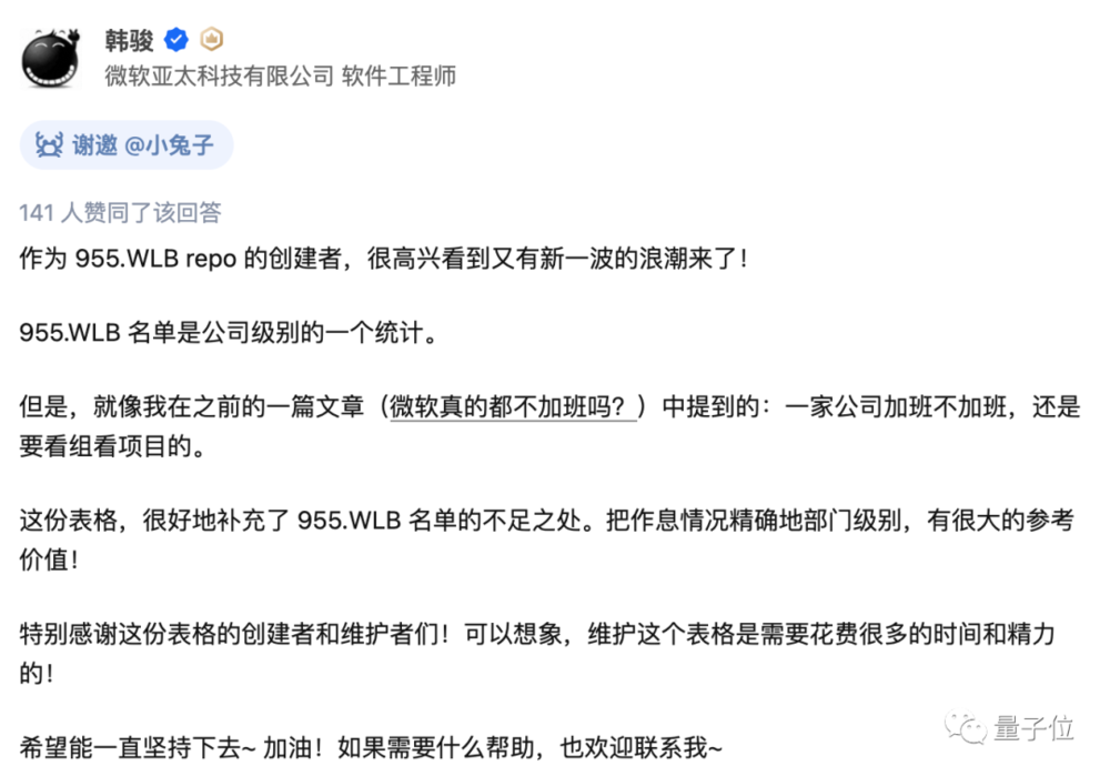 此前登上过GitHub周榜第二的“955.WLB不加班公司名单”创建者、微软软件工程师韩骏,也给这个项目点了赞,并表示很愿意提供帮助: