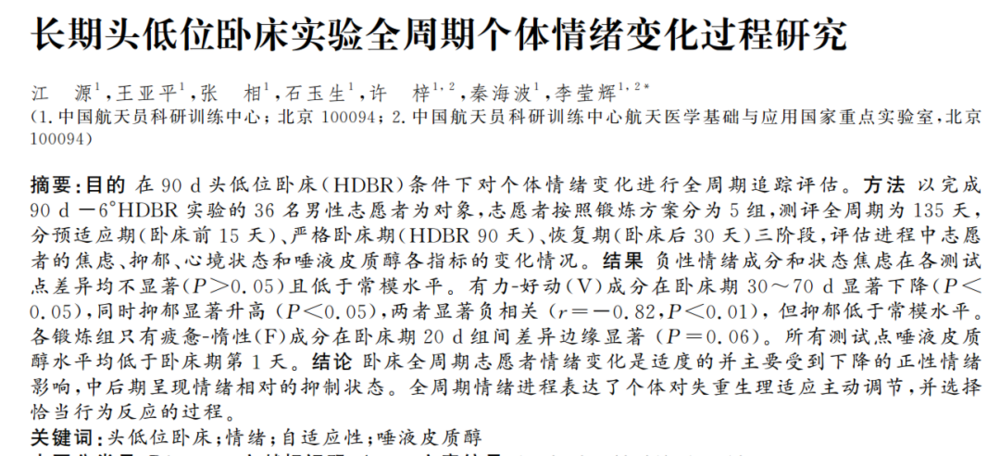 作为博士,肯定是要发论文的,王亚平也成功完成了此任务,在国内核心期刊上发表了研究成果[1]。她的研究主题是:“在头低脚高的床上待满 90 天的志愿者,整个实验期内有什么情绪变化?”。
