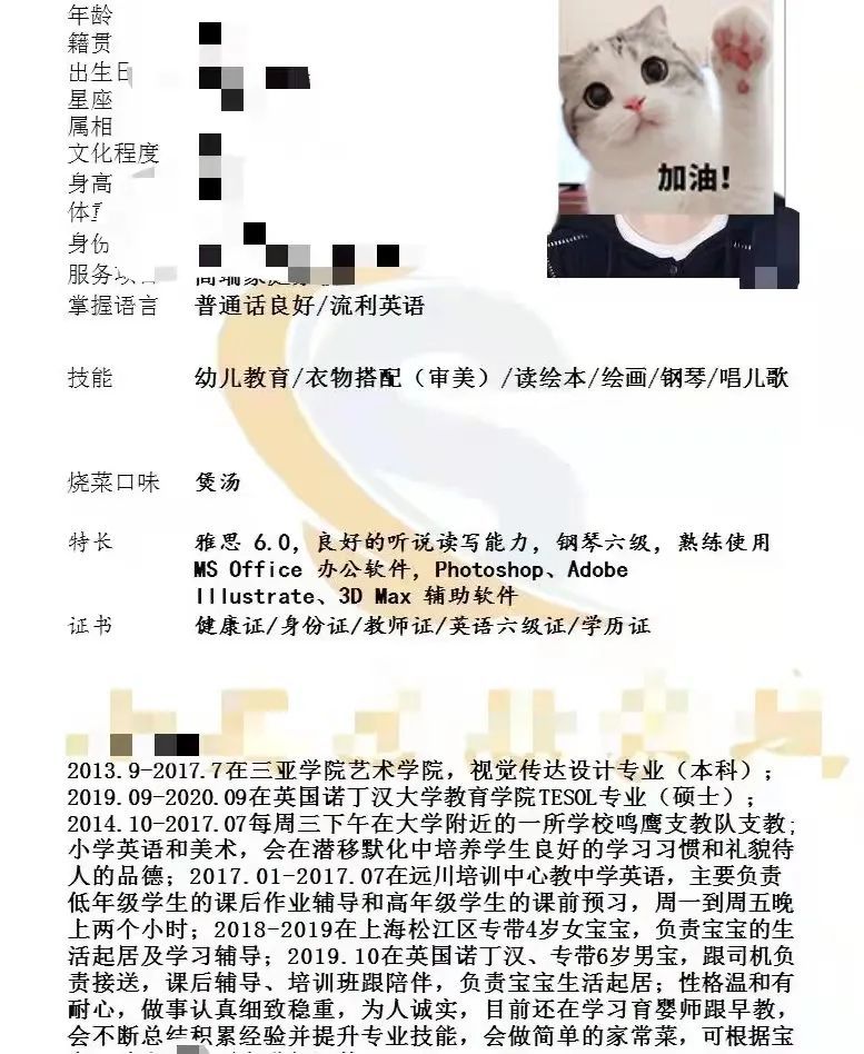 看着那些海外留学甚至读了艺术的90后阿姨们,赵圆圆瑟瑟发抖,决定要让大家都感受到这种震撼,就扔了几份简历到宝妈群里面。宝妈纷纷没出息得表示,这种阿姨看起来就不正常,请回家啊,感觉要担心男主人的安危。