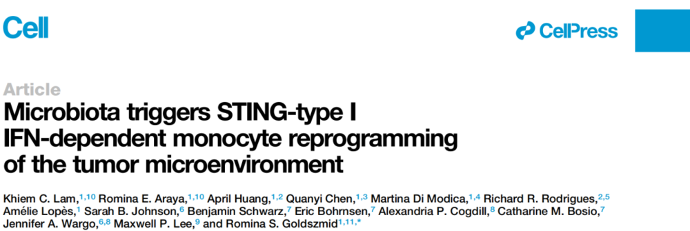 [1]Lam KC, Araya RE, Huang A, Chen Q, Di Modica M, Rodrigues RR, Lopès A, Johnson SB, Schwarz B, Bohrnsen E, Cogdill AP, Bosio CM, Wargo JA, Lee MP, Goldszmid RS. Microbiota triggers STING-type I IFN-dependent monocyte reprogramming of the tumor microenvironment. Cell. 2021 Oct 4:S0092-8674(21)01066-7.