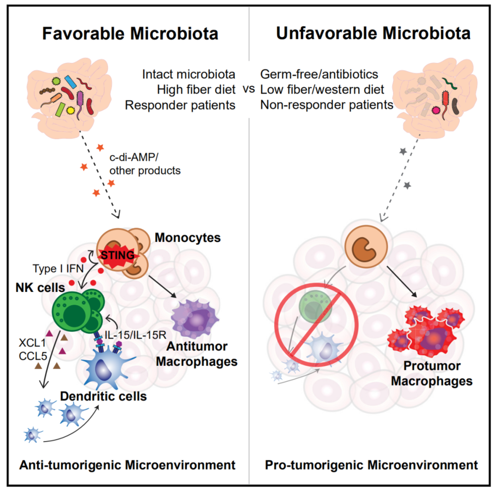 来自美国国家癌症研究所的Romina S. Goldszmid和他的同事们发现,高纤维饮食有利于一些肠道菌群定植,这些肠道菌群通过STING-IFN-Ⅰ通路,能够有效调节肿瘤中单核吞噬细胞(MPs)的组成,改善肿瘤微环境,提高免疫治疗的疗效。