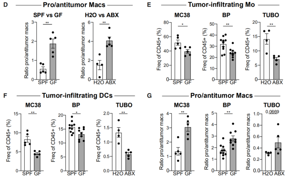 有肠道菌群定植的小鼠的肿瘤内,“友军”单核吞噬细胞更多。