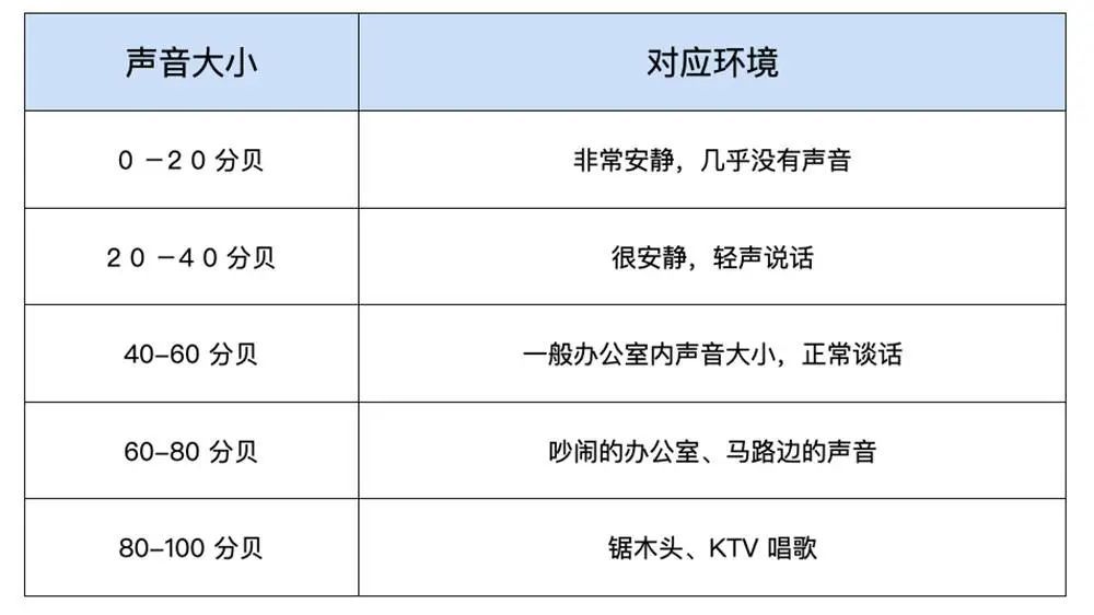 在我们的课本或者其他科普书籍中,也经常会看到不同声音大小对应的常见环境,一般超过 80 分贝,对普通人来说就是非常嘈杂的环境了。