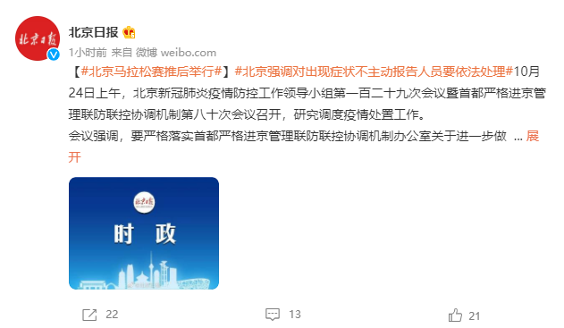 @新京报【北京马拉松赛推后举行】北京马拉松赛组织委员会今天发布公告:由于北京市近期发生多例京外关联本地确诊病例,为防范疫情传播扩散风险,切实保障广大跑友、工作人员和市民的健康安全,经组委会慎重研究决定,原定于10月31日举办的2021贝壳北京马拉松、原定于10月29日—30日举办的北京·马拉松博览会及原定于10月30日举办的北京马拉松阿迪达斯亲子跑活动均延期举办,具体时间另行通知。