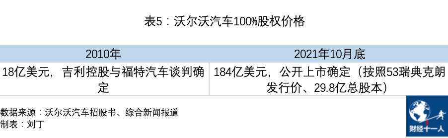 沃尔沃上市后,总股本为29.8亿股,按照按照每股53瑞典克朗的发行价,总市值1579亿瑞典克朗,约184亿美元。
