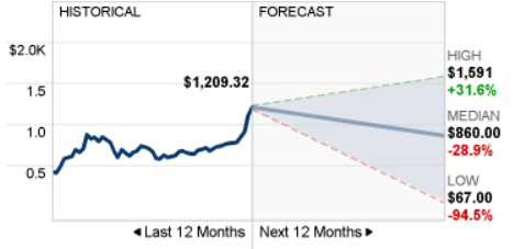 目前华尔街分析师给出的未来12个月目标价最高为1591美元,最低为67美元,牛熊价差为1524美元,也触及纪录新高。目标价中值为860美元,平均值为810.49美元。其中目标价中值比12个月前的1209.32美元下降了28.9%。