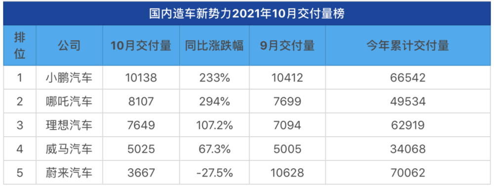 不仅是小鹏、理想,习惯于用“蔚小理”代表造车新势力的投资者或许应该注意,蔚来10月交付量也落后于新能源造车独角兽哪吒汽车和威马汽车。