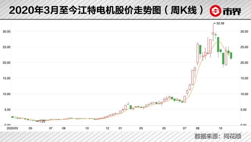 在新能源汽车赛道火热、锂电池原材料价格上涨的利好之下,江特电机的股价从2020年5月的1.25元附近,飙升至2021年9月最高的32元附近,对应市值也从21亿元增至最高时的555亿元,增幅达到25倍以上。