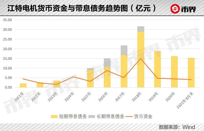 截至2021年9月末,江特电机账面货币资金4.03亿元,一年内到期的带息债务合计15.41亿元,缺口高达11.38亿元,相比2019年缺口最大时的14.08亿元虽然有所收窄,但资金依然处于相当紧张的状态。