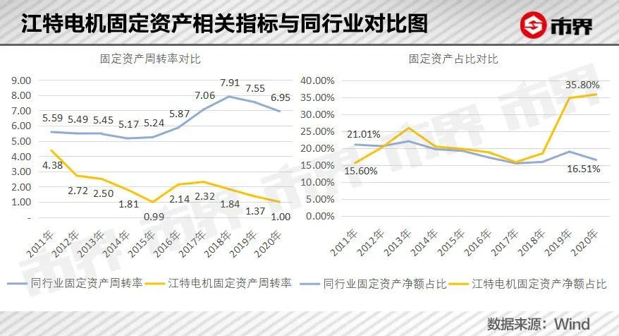 如果固定资产增长能提高生产能力,带来效益,倒也可以理解,但伴随着固定资产大幅增长的,是江特电机越来越低的固定资产周转率(次数)——从2011年的4.38次降至2020年的1次左右,意味着固定资产的使用效率越来越低。