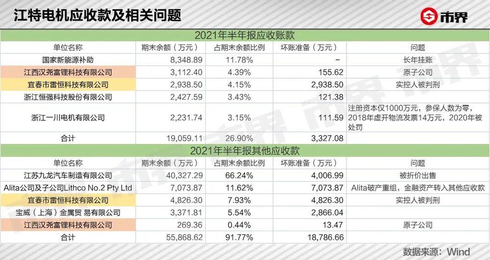 如下图所示,江西汉尧富锂和宜春雷恒科技,同时出现在应收账款和其他应收款明细中。江西汉尧富锂曾经是江特电机的一家子公司,2020年8月被江特电机以9872.71万元的价格出售,但时隔半年,这家公司就以3112.4万元的欠款金额位列江特电机应收账款第二位,相当于该公司总价值的31.52%。