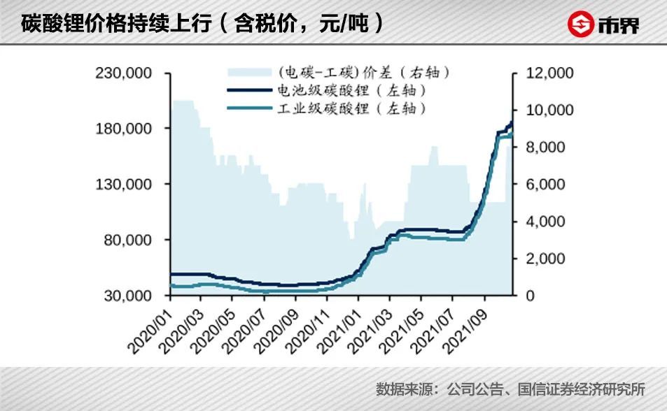 而锂原料受限于资源、技术、 环保等多方面因素,短期内锂资源短缺格局或难以扭转。据国信证券整理的数据显示,电池级碳酸锂价格已经从2020年年初的不到5万元/吨,上涨至目前的超过18万元/吨,上涨幅度超过300%。