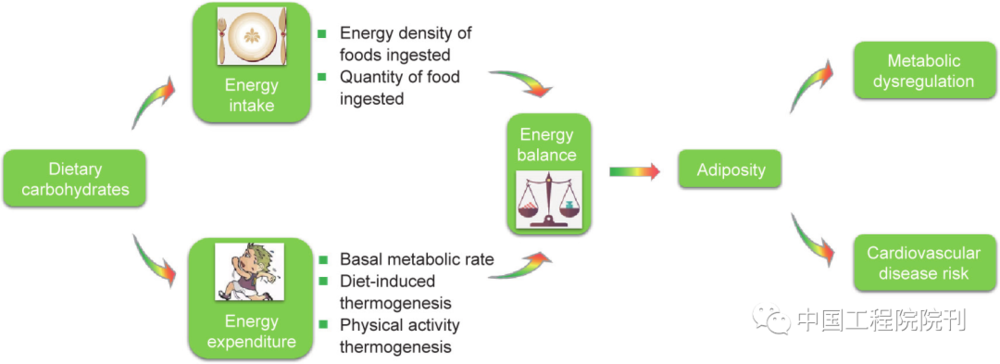 图1 能量平衡时各组分与膳食碳水化合物之间的相互作用示意图,以及能量过剩对人体健康的影响
