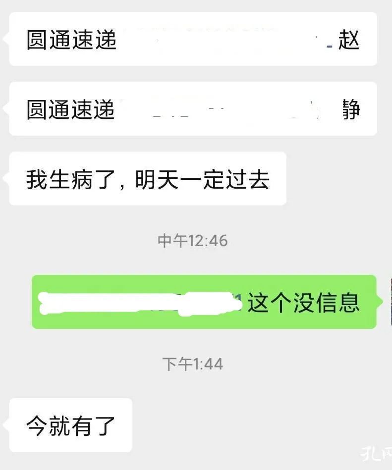 但我这边也真没敢怠慢,不停的和快递联系,可怎么也联系不上他,他是电话也不接,微信也不回,像是人间蒸发了一样。最后我只能如实相告并截屏发于客户,还好是得到了买家的谅解,允许今天发货。昨晚都快二点了手机响了,快递回过来信息说:“我生病了,明天一定去。”
