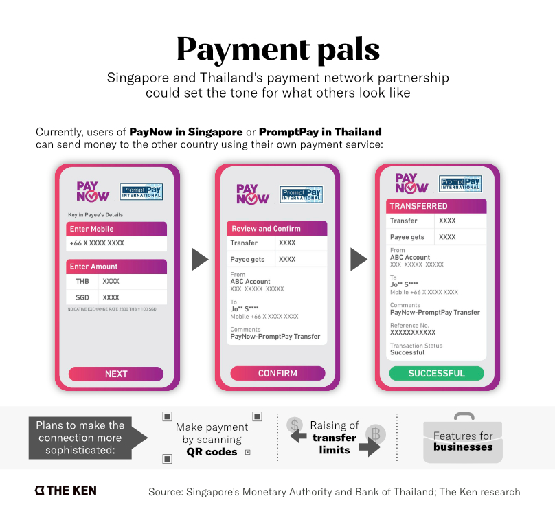 2021年4月,新加坡的PayNow和泰国的PromptPay宣布一项合作,允许两家平台的用户每天向彼此支付至多1000新元(合25000泰铢或741美元)。最初,它只能通过银行转账,但打算扩大范围,包括推出已被广泛接受的二维码等。