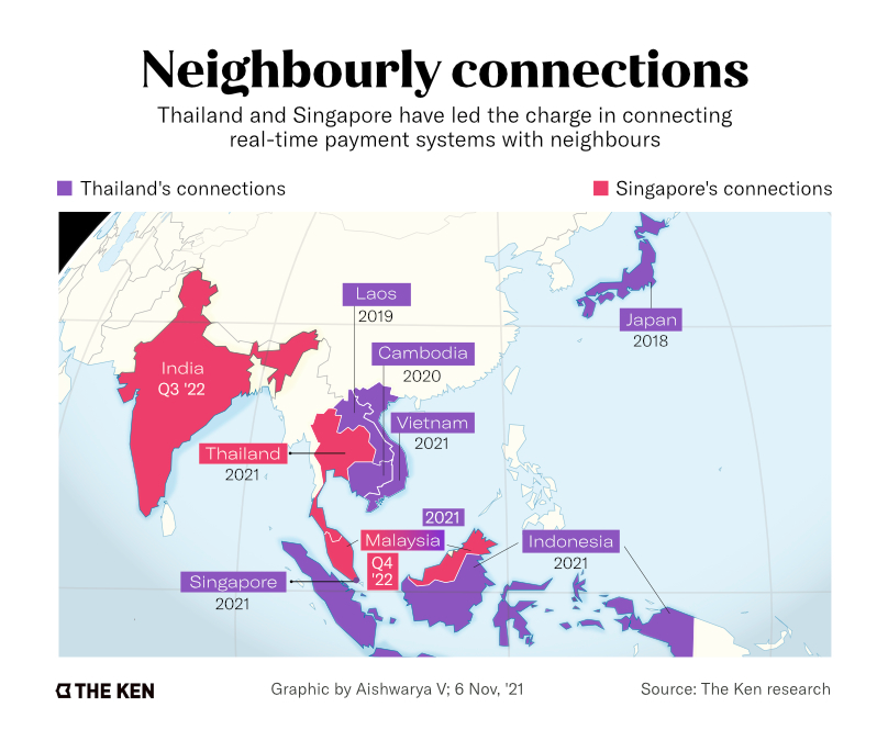 泰国已经与6个国家签署协议,未来可能还会跟更多国家建立连接。与此同时,新加坡宣布将以“即买即付”的模式,与印度的统一支付接口(UPI)和马来西亚的DuitNow合作。
