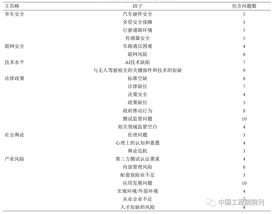 近期,中国工程院院刊《中国工程科学》优先出版了中国工程院郑南宁院士科研团队的《无人驾驶安全风险的识别与度量研究》。文章开展了无人驾驶安全风险的关键要素定义与识别,并进行了定量测量,率先提出了无人驾驶安全风险六要素框架:单车安全、联网安全、技术水平、法律政策、社会舆论、产业风险。