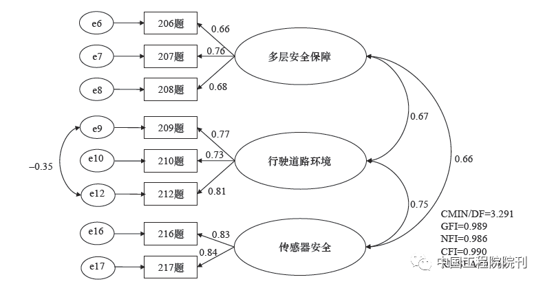 在收敛效度方面,“多层安全保障”“行驶道路环境”“传感器安全”3个因子的平均变异萃取量(AVE)分别为0.495、0.592、0.698,“多层安全保障”极为接近0.5,另外两个均大于0.5 ;相应的组合信度(CR)分别为0.746、0.813、0.822(均大于0.7),表明各个因子均有较好的收敛效度。在区分效度方面,3 个因子的AVE 平方根均大于与其他因子之间的相关系数,表明该部分模型具有较好的区分效度。