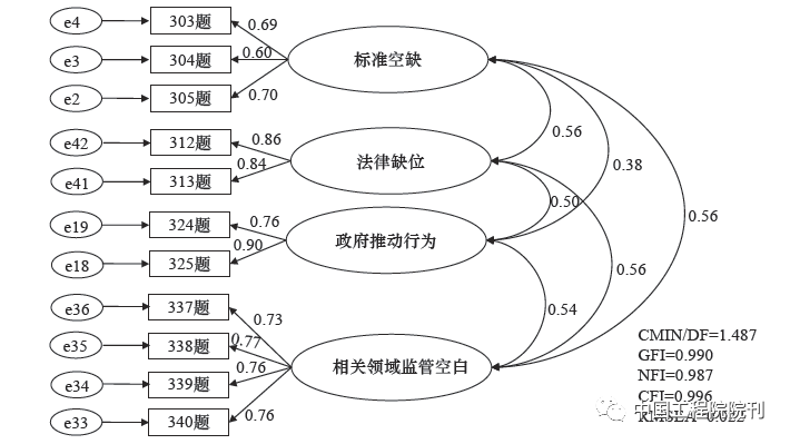 在收敛效度方面,“标准空缺”“法律缺位”“政府推动行为”“相关领域监管空白”4 个因子的AVE 分别为0.437、0.720、0.695、0.577, 有3 个大于0.5 ;相应的CR 分别为0.698、0.837、0.819、0.845,有3 个大于0.7,表明本次验证的各个因素具有较好的收敛效度。