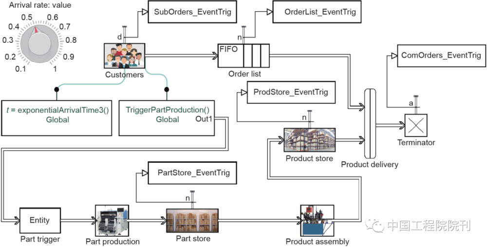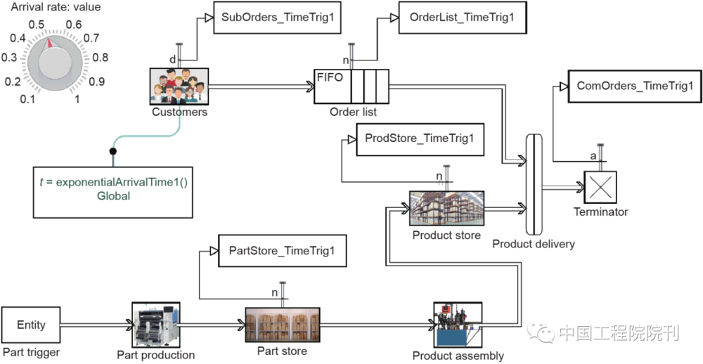 生产后,将每批零件存放在零件库存中。客户的订单到达后会触发产品组装线。如果零件库存中有足够的零件可用于生产所需的产品,产品组装线将要求提供所需的零件,并启动生产工作。如果没有足够的零件,产品组装线将等待零件生产线生产出足够的零件。