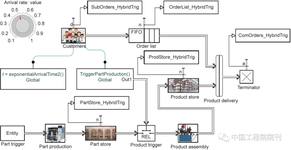 在混合触发模型中,订单量不会影响零件生产过程,但会影响产品组装过程。混合触发模型中的产品库存用于临时存放产品,这是因为产品一旦制造完成,库存中的所有产品都会被立即交付给客户。