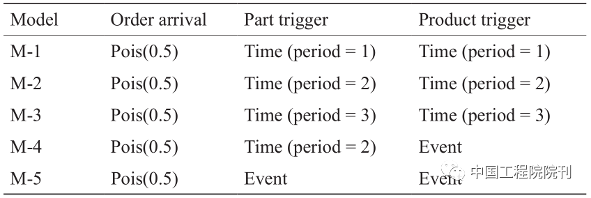 模型-5由事件触发,因此,零件生产线和产品组装线均由到达订单触发。这些仿真模型有两种触发条件,即零件触发条件和产品触发条件。零件触发条件适用于事件触发模型(模型-5),产品触发条件适用于混合触发模型(模型-4)。