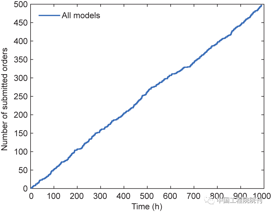 已完成订单数量指的是已完成并交付给客户的所有订单的数量。该值实际上等于图4至图6中到达终端的订单数量。只有当成品与订单匹配后,才认为完成了该订单。
