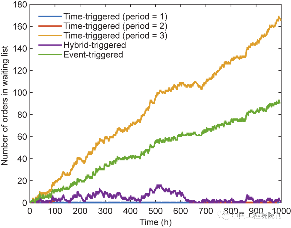 到仿真时间(te = 1000 h)结束时,时间触发(周期=3)模型和事件触发模型的等待订单数量分别达到170和90。这一结果表明,时间触发(周期=1、周期 =2)模型和混合触发模型在等待时间结束时,等待订单数量会收敛,而时间触发(周期=3)模型和事件触发模型的等待订单数量则不会收敛。