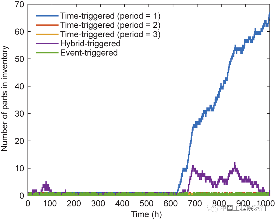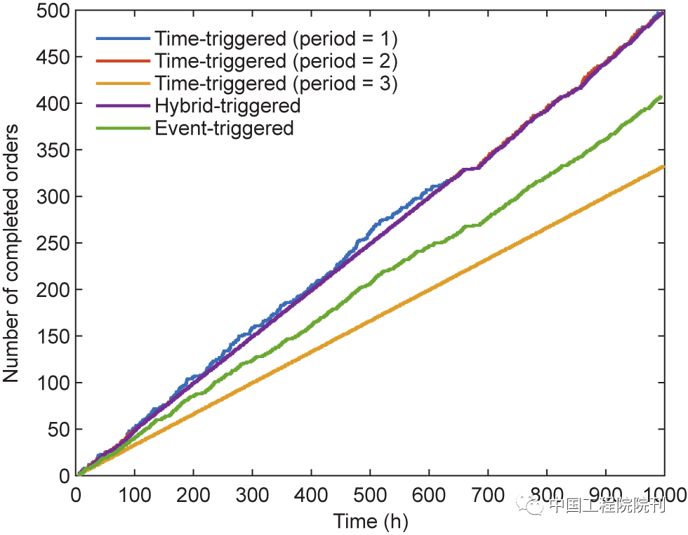 有时(t = 500 h和t = 600 h之间),周期更短的时间触发模型(周期=1)的性能要略微优于时间触发模型(周期=2)和混合触发模型。就已完成订单数量而言,周期更长的时间触发模型(周期=3)以及事件触发模型的性能要逊于周期更短的时间触发模型(周期=1、周期=2)和混合触发模型。