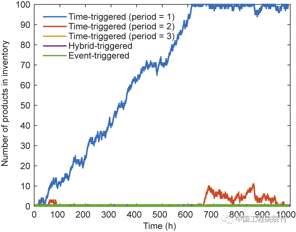 图11比较了5个生产触发模型的库存产品数量随时间变化的结果。如图所示,时间触发(周期=2、周期 =3)模型、混合触发模型、事件触发模型的性能很好,但在t = 650 h到t = 950 h的这段时间内,时间触发(周期=2)模型出现小幅波动。