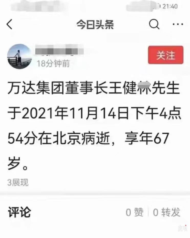 据悉,11月14日晚21时21分,今日头条用户@身拥大海2 发布消息称,万达集团董事长王健林于2021年11月14日下午4点54分在北京病逝,享年67岁。