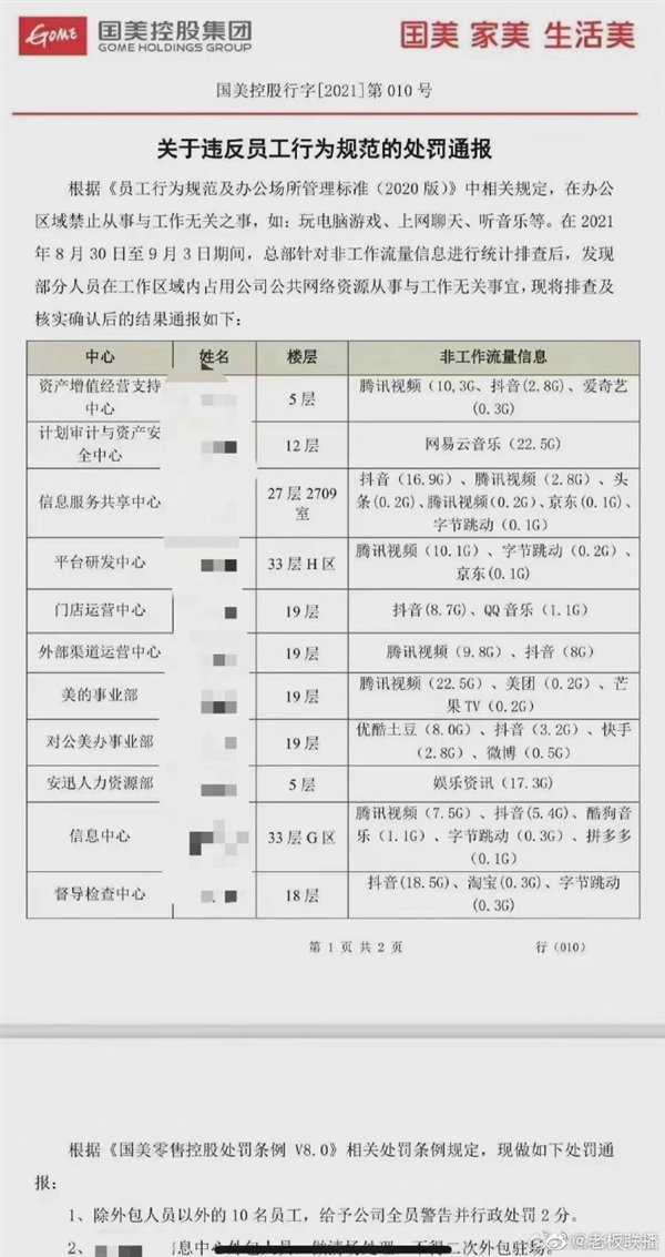 @快科技【国美回应“通报员工上班摸鱼”:遵循员工手册对员工进行管理】据@老板联播 消息,11月16日,国美发布《关于违反员工行为规范的处罚通报》。文件显示,在8月30日-9月30日期间,国美总部针对非工作流量信息进行统计排查后,发现部分员工在工作区域内占用公司公共网络资源从事与工作无关事宜。如:玩电脑游戏、上网聊天、听音乐等。根据公司规定11位员工(包括一名外包)进行了通报和相应处罚。