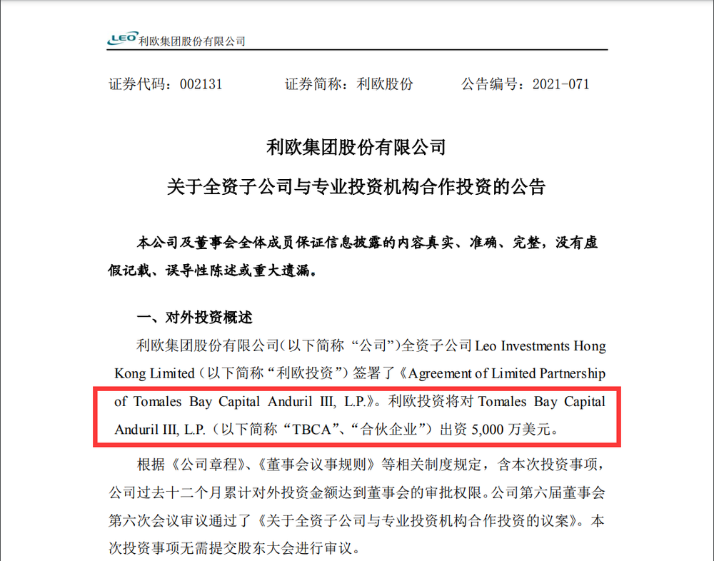 @每日经济新闻【上市公司要出资5000万美元,和马斯克一起造火箭?】11月16日,利欧股份(002131,SZ)发布公告称,公司全资子公司利欧投资签署了《Agreement of Limited Partnershipof Tomales Bay Capital Anduril III,L.P.》。利欧投资将对Tomales Bay CapitalAnduril III,L.P.(简称“TBCA”、“合伙企业”)出资5000万美元。合伙企业的投资标的为Space Exploration Technologies Corp.(“SpaceX”)。