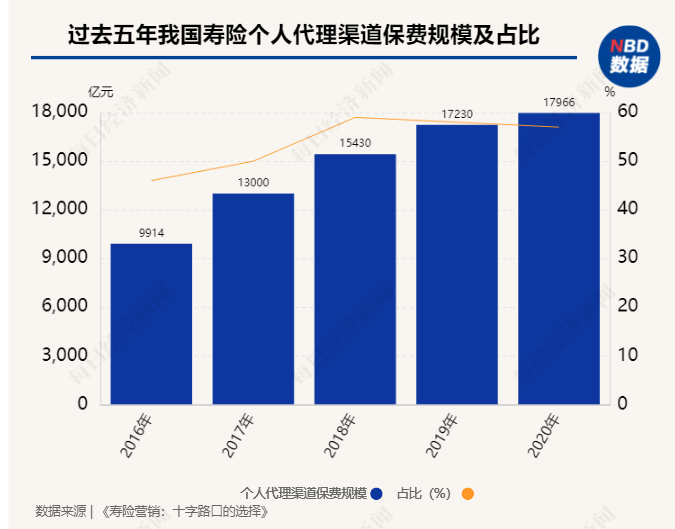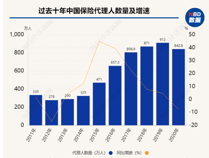 数据显示,2020年末保险代理人数量同比下滑7.59%,缩减至842.8万人。