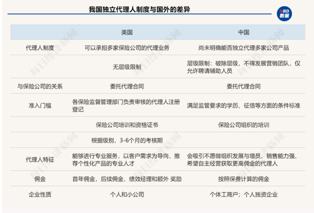 开源证券分析称,从保险发达市场经验来看,目前美国保险代理人规模为34万人,其中独立代理人19万人,占比56%;保险市场份额独立代理人占比49%,高于专属代理人的41%。我国独立代理人制度尚未实现业务上与保险公司的“独立”,具体管理方式及责任落实仍有待摸索。