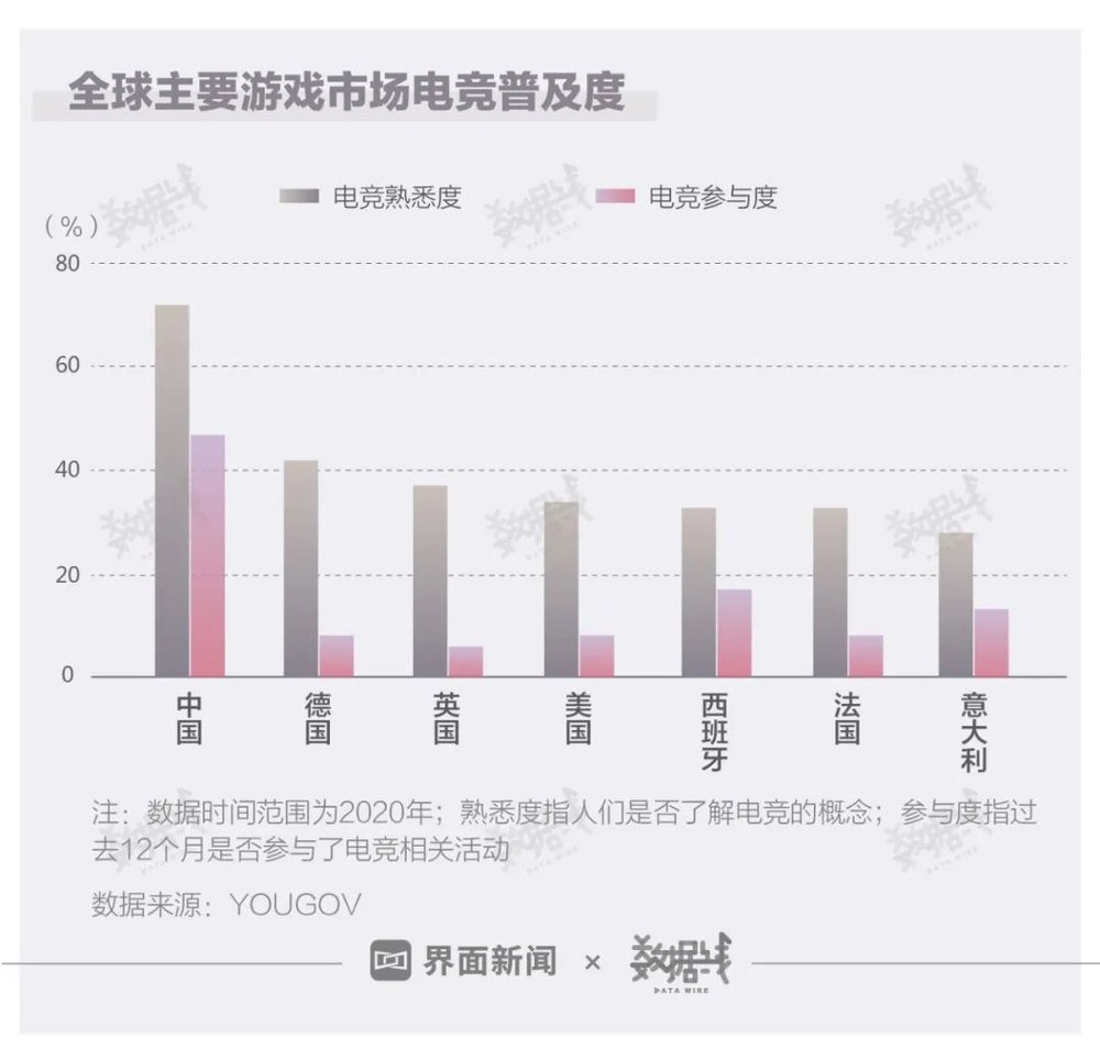 游戏大国中,中国电竞越来越火,但欧美国家对电竞的热情不高。YouGov2020年的一项调查显示,7个主要游戏市场中,只有中国对电竞的参与度较高。