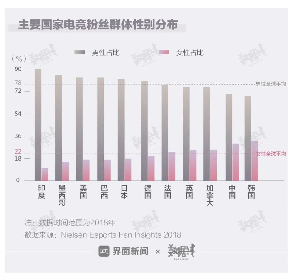 相比其他国家,中国女性更爱电竞,虽然“男粉”数量更多,但占比低于全球平均水平。据尼尔森2018年报告数据,全球11个国家中,法国、英国、加拿大、中国和韩国5个国家男性电竞粉丝占比低于全球平均水平(78%),女性电竞粉丝占比高于全球平均水平(22%)。美国、日本等国家男性粉丝占比均在8成以上,女性粉丝不足2成。