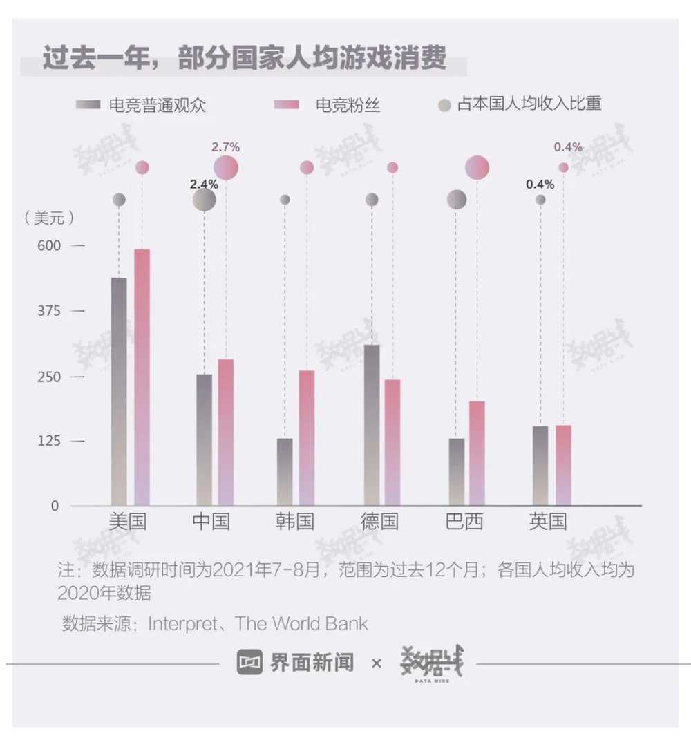 哪个国家的电竞粉丝最舍得花钱?据Interpret2021年最新统计,6个主要国家中,美国的电竞用户在游戏上开销最大,电竞粉丝人均年消费接近500美元(约合人民币3191元,依据实时汇率计算,下同)。其次是中国,电竞粉丝人均年消费为283美元(约合人民币1806元)。