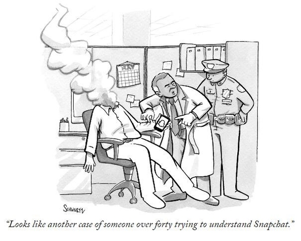 2016年,《纽约客》刊载过这样一幅漫画:一位头颅爆炸化作青烟、身材明显开始走形的男子,手中紧紧攥着的手机上,Snapchat的幽灵ICON清晰可见。在他的身边,面对警员的质询,验尸官直截了当地给出了结论: “看起来,又是一桩40多岁的中年佬试图了解Snapchat而酿成的惨案。”