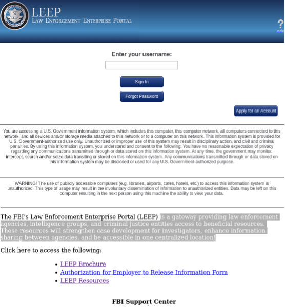 The FBI's Law Enforcement Enterprise Portal (LEEP)网站页面