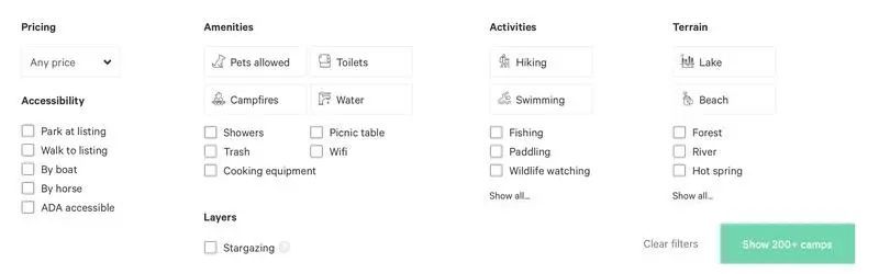目前HipCamp已然成为全球头部的露营地预定平台,提供包括帐篷露营、房车公园、小木屋、树屋和豪华露营等多种选择。