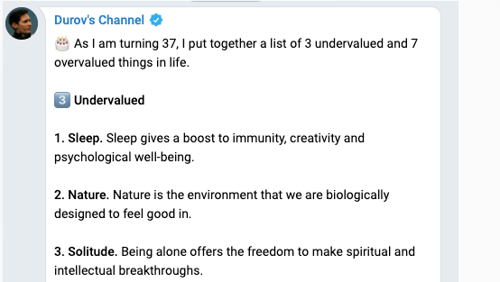 最近网上很火的警句——Telegram创始人的Pavel Durov在生日之际发表的10点人生忠告中提到的:生活中被低估的三件事分别是睡眠、大自然和孤独感。