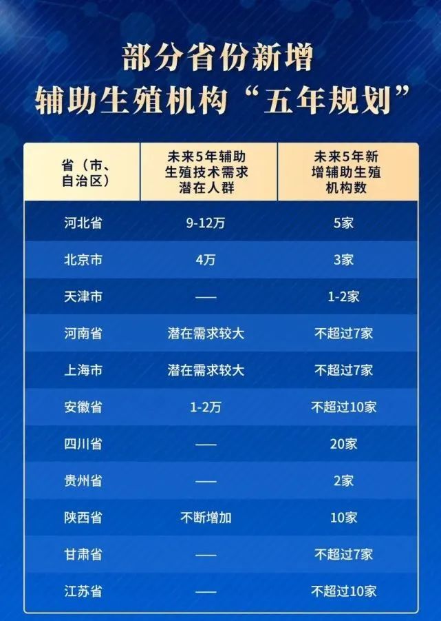 陕西、山西、安徽等省份在5年规划中提出,将按照每230~300万人口设置1个机构,在2021年至2025年期间规划新增辅助生殖机构,均衡地区差异。