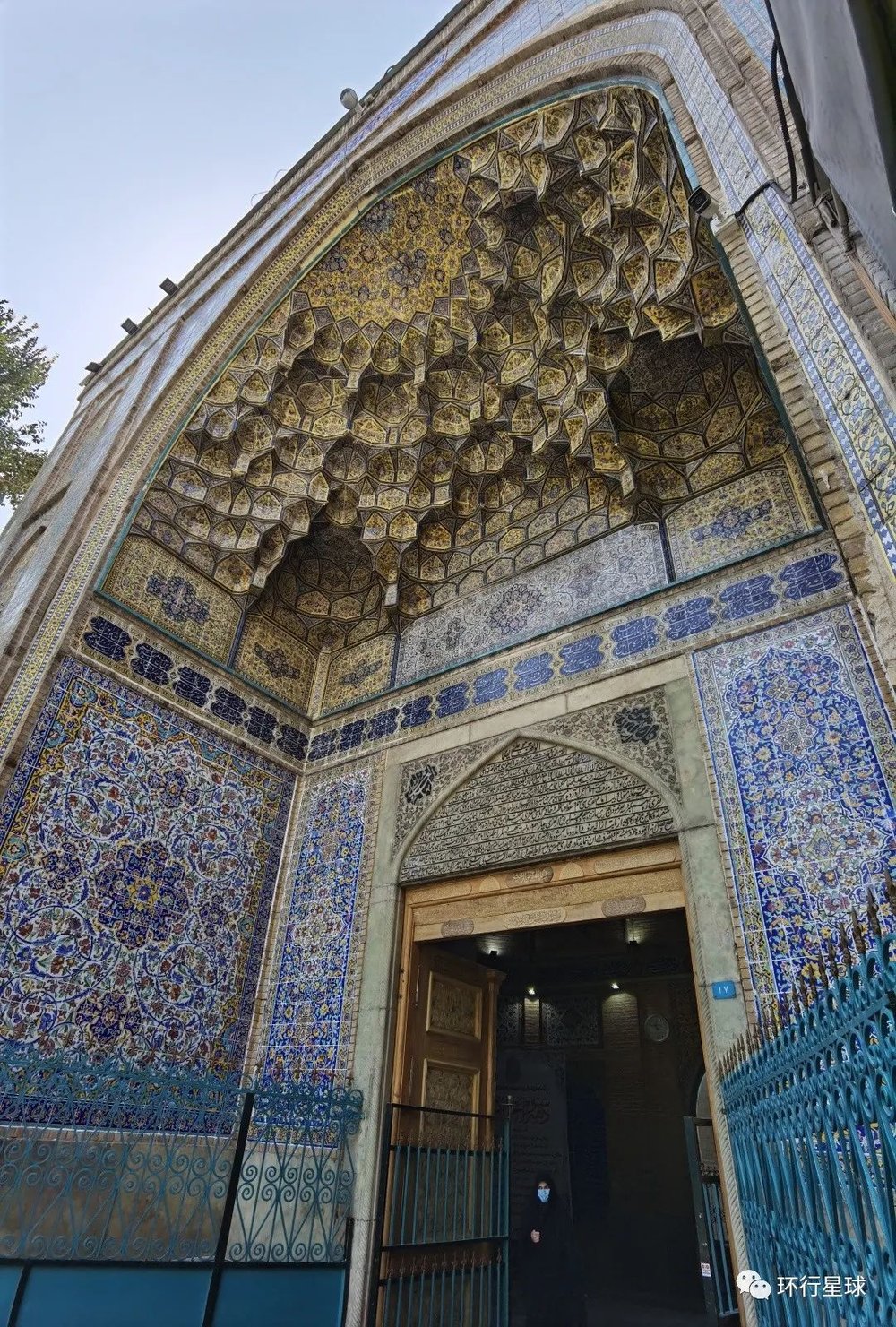 国王清真寺入口处复杂华丽的瓷砖,头顶蜂巢状的Muqarnas描绘着人们对天堂的想象▾